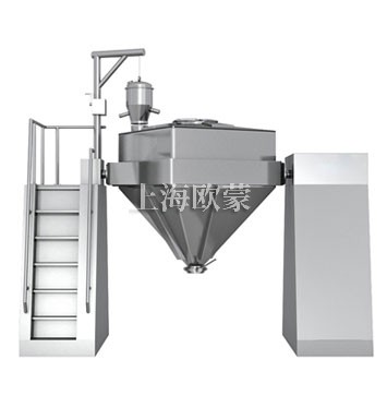 將物料裝入方錐形密閉混合桶內,料斗對稱的軸線與回轉軸軸線成一夾角,不同組分物料在密閉的料斗中進行三維空間運動,產生強烈翻轉和擴散收縮作用,達到較佳的混合效果。