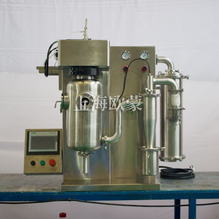 經(jīng)過前道工序處理后的料液利用蠕動泵送至干燥室上方的霧化器,將料液均勻地霧化為極微米霧滴群,進入干燥室內(nèi),氣體進入加熱系統(tǒng),被加熱至工藝所需的溫度,經(jīng)熱風管道均勻進入干燥室,與霧滴群接觸后高溫固化,熱解成產(chǎn)品,干燥后的成品隨同尾氣經(jīng)出風管送至旋風分離器進行氣固分離 ,成品回收,飽和尾氣經(jīng)過除塵器濾芯過濾后進入OM-YJ-500型氮氣循環(huán)有機溶劑回收裝置的冷凝器進行溶劑回收,經(jīng)過冷凝后的氮氣再次進入加熱器循環(huán)使用。